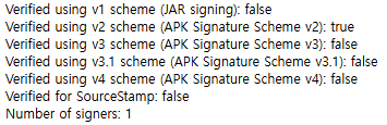 아래는 apksigner로 서명 정보를 확인했을 때 나오는 화면이다.